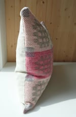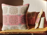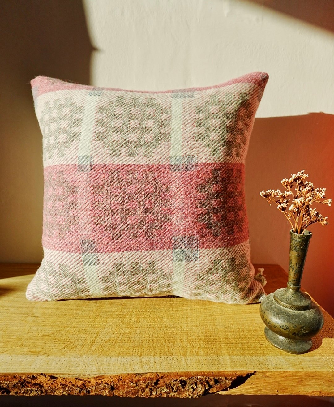 Handwoven square cushion. The front is a woven Welsh pattern, made from sheep's wool, in pink, white, green and blue colours. The back is a plain natural linen fabric (grey).