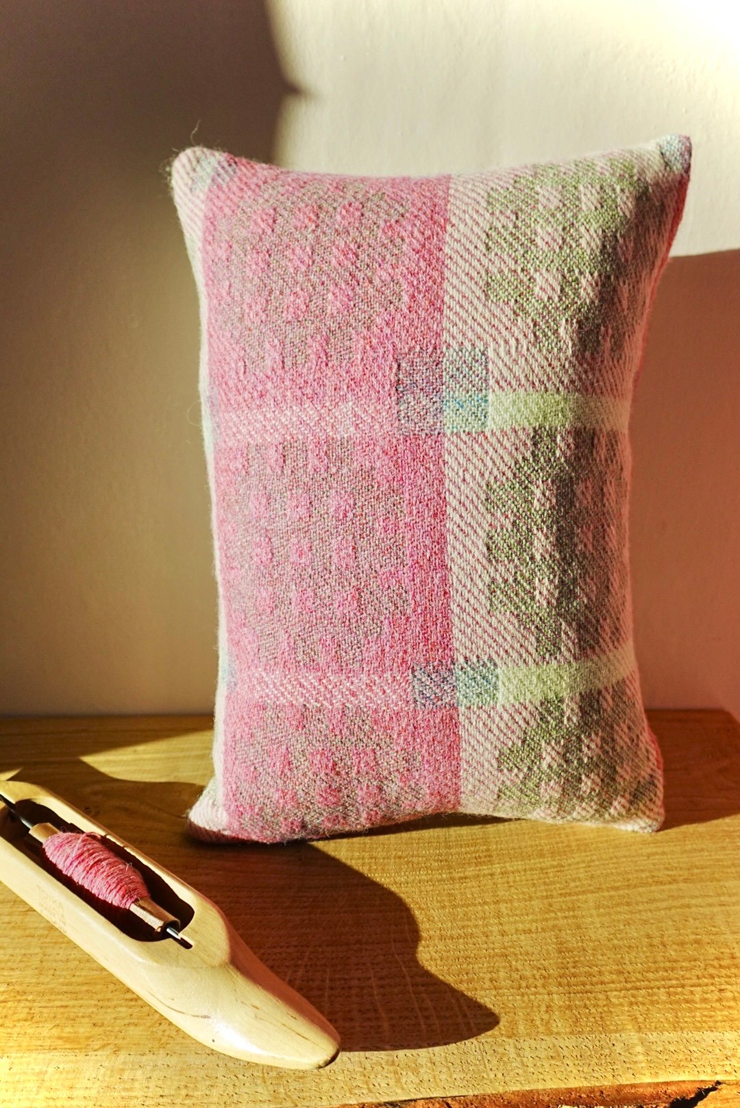 Handwoven cushion. The front is a woven Welsh pattern, made from sheep's wool, in pink, white, green and blue colours. The back is a plain natural linen fabric (grey).