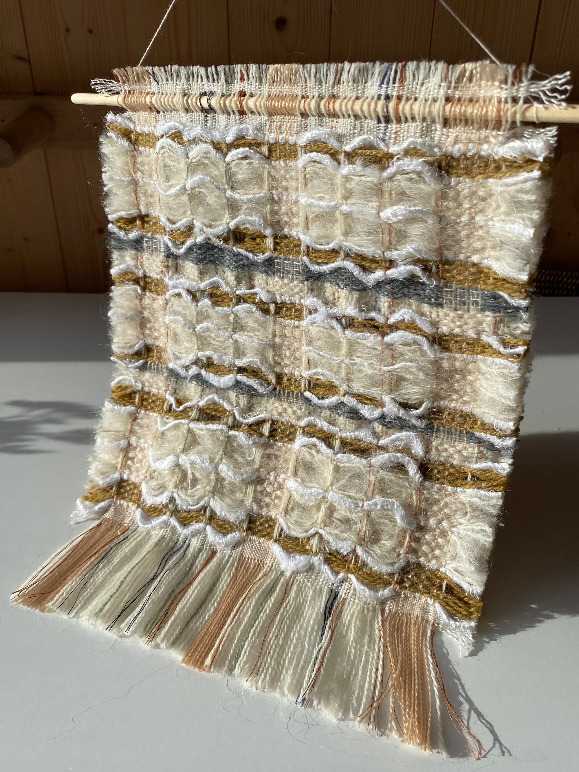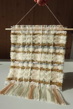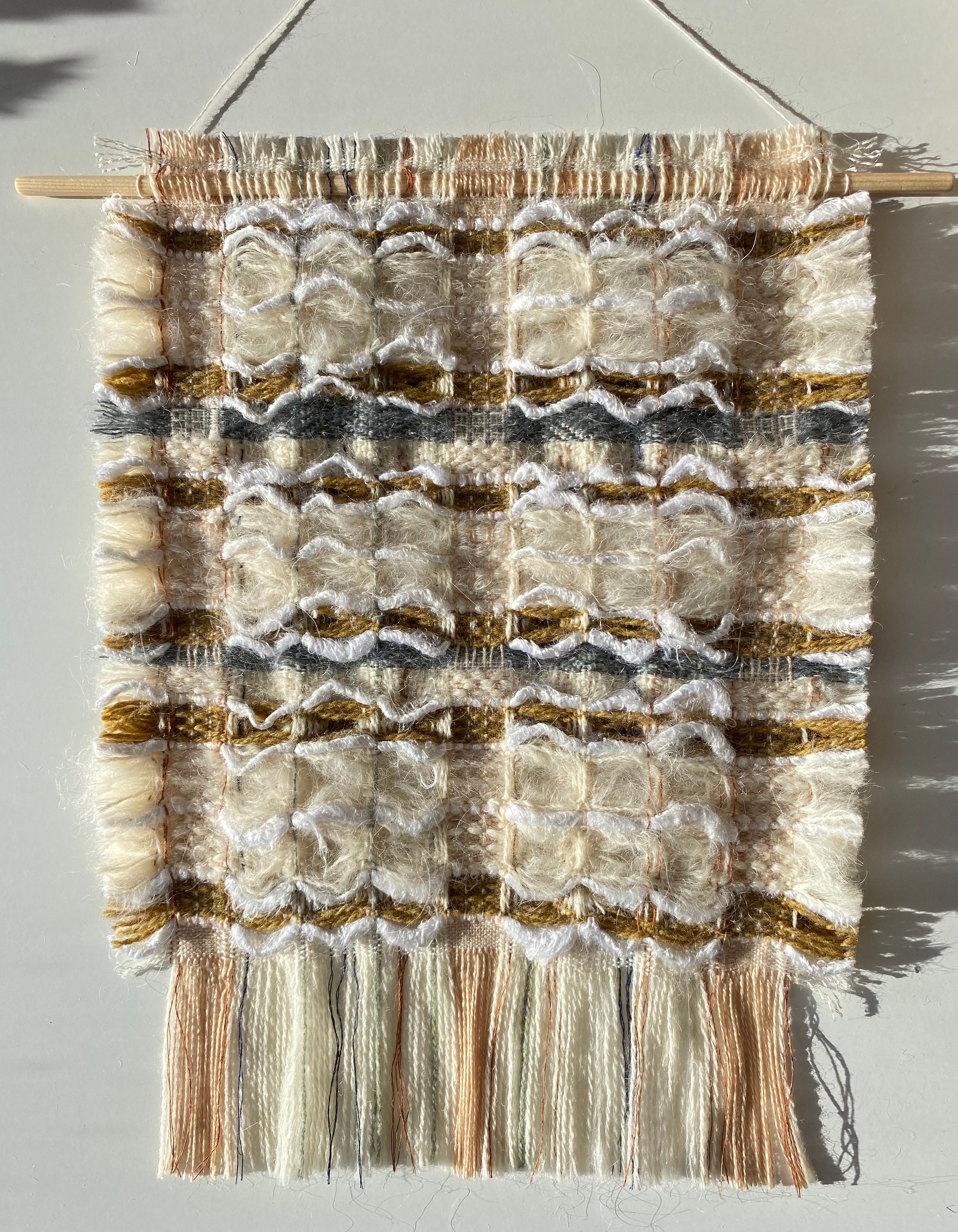 A one-of-a-kind, mini wall hanging. Woven with soft to touch fibres and comforting colours. All of the materials are natural and biodegradable.