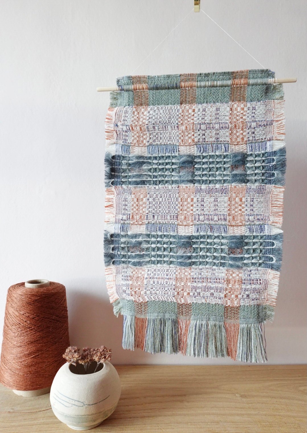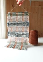 A one-of-a-kind wall hanging. Woven with soft to touch fibres and calming colours. All of the materials are natural and biodegradable.