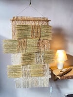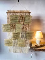 A one-of-a-kind, wall hanging. Woven with dried, plant textures and hand-pained hues of natural dyes. All of the materials are natural and biodegradable.