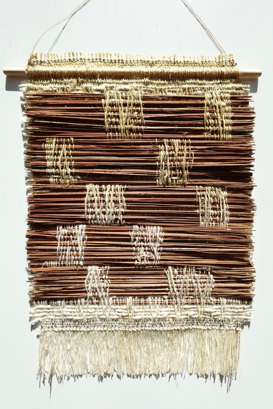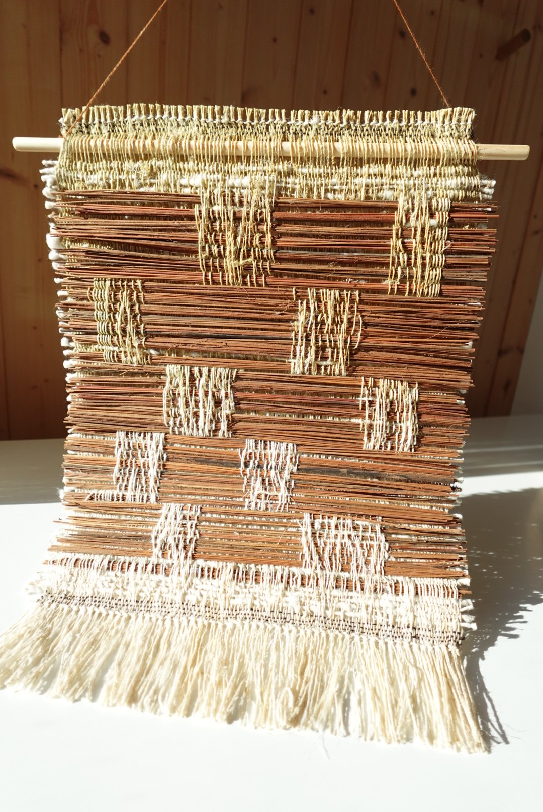 This wall hanging is unframed and has a pine wooden dowel woven into the piece.