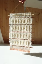 This wall hanging is unframed and has a pine wooden dowel woven into the piece.