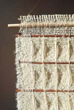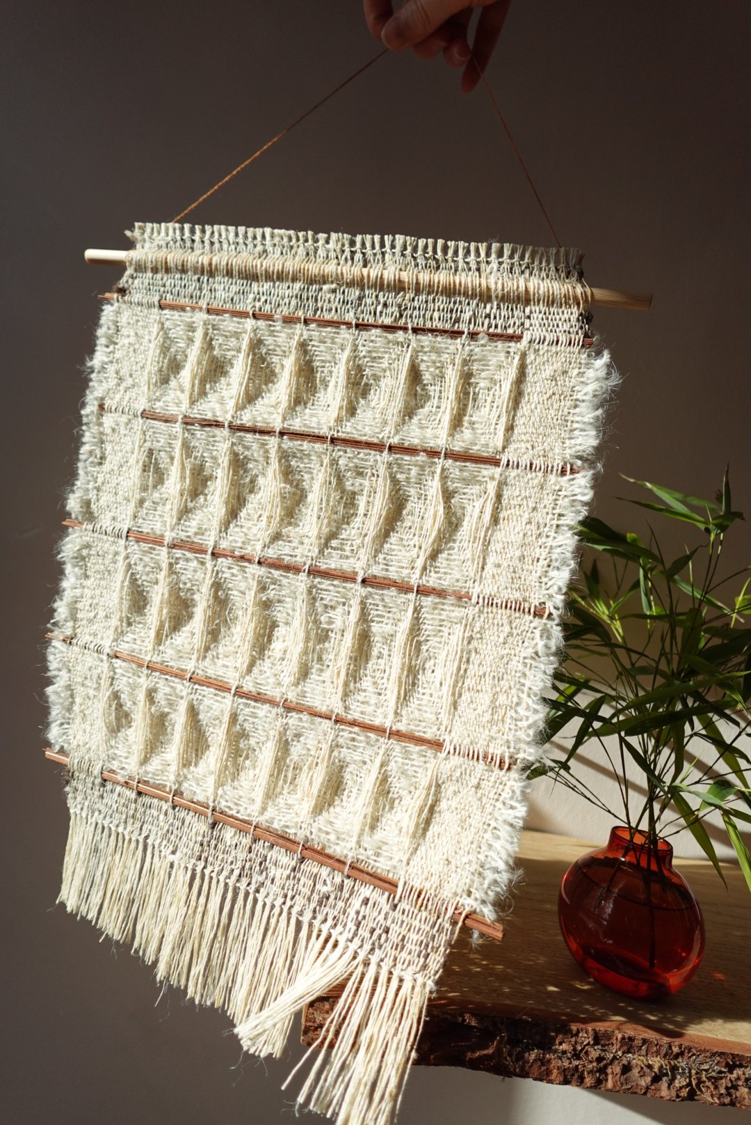 A one-of-a-kind, wall hanging. Woven with plant textures and a three-dimensional waffle pattern. All of the materials are natural and biodegradable.