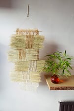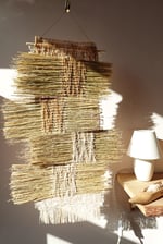 A one-of-a-kind, wall hanging. Woven with dried, plant textures and hand-pained hues of natural dyes. All of the materials are natural and biodegradable.