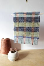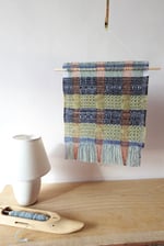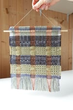 A one-of-a-kind, mini wall hanging. Woven with soft to touch fibres and comforting colours. All of the materials are natural and biodegradable.