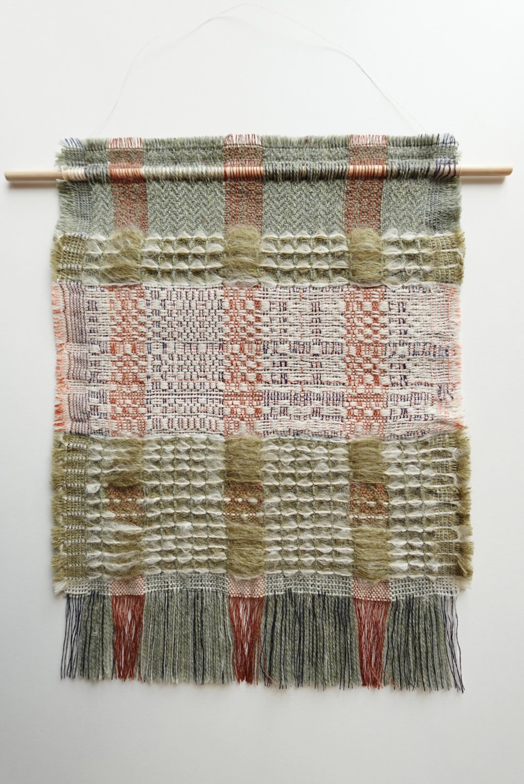 This wall hanging is unframed and has a pine wooden dowel woven into the piece.