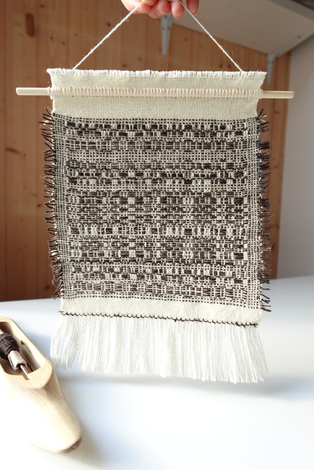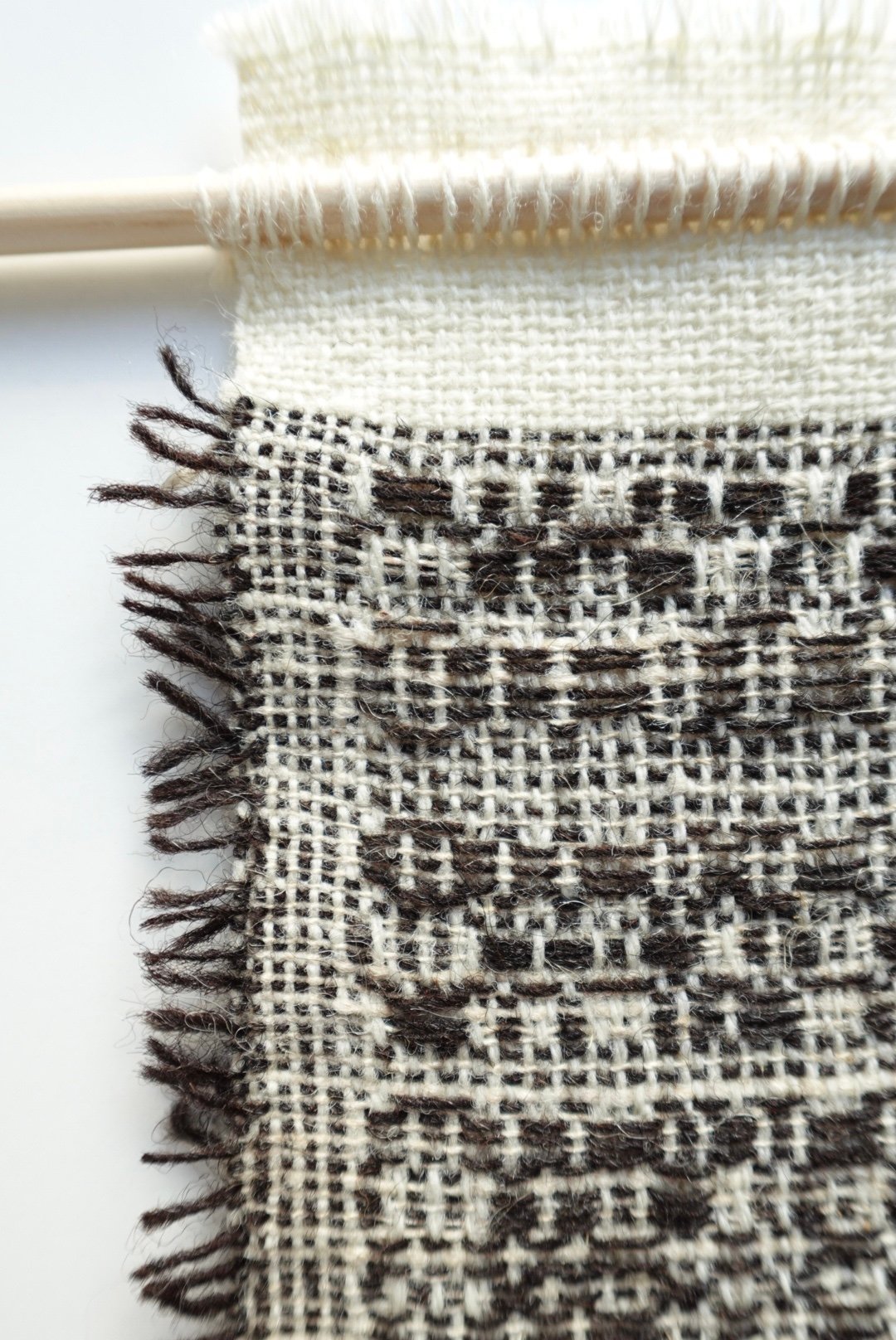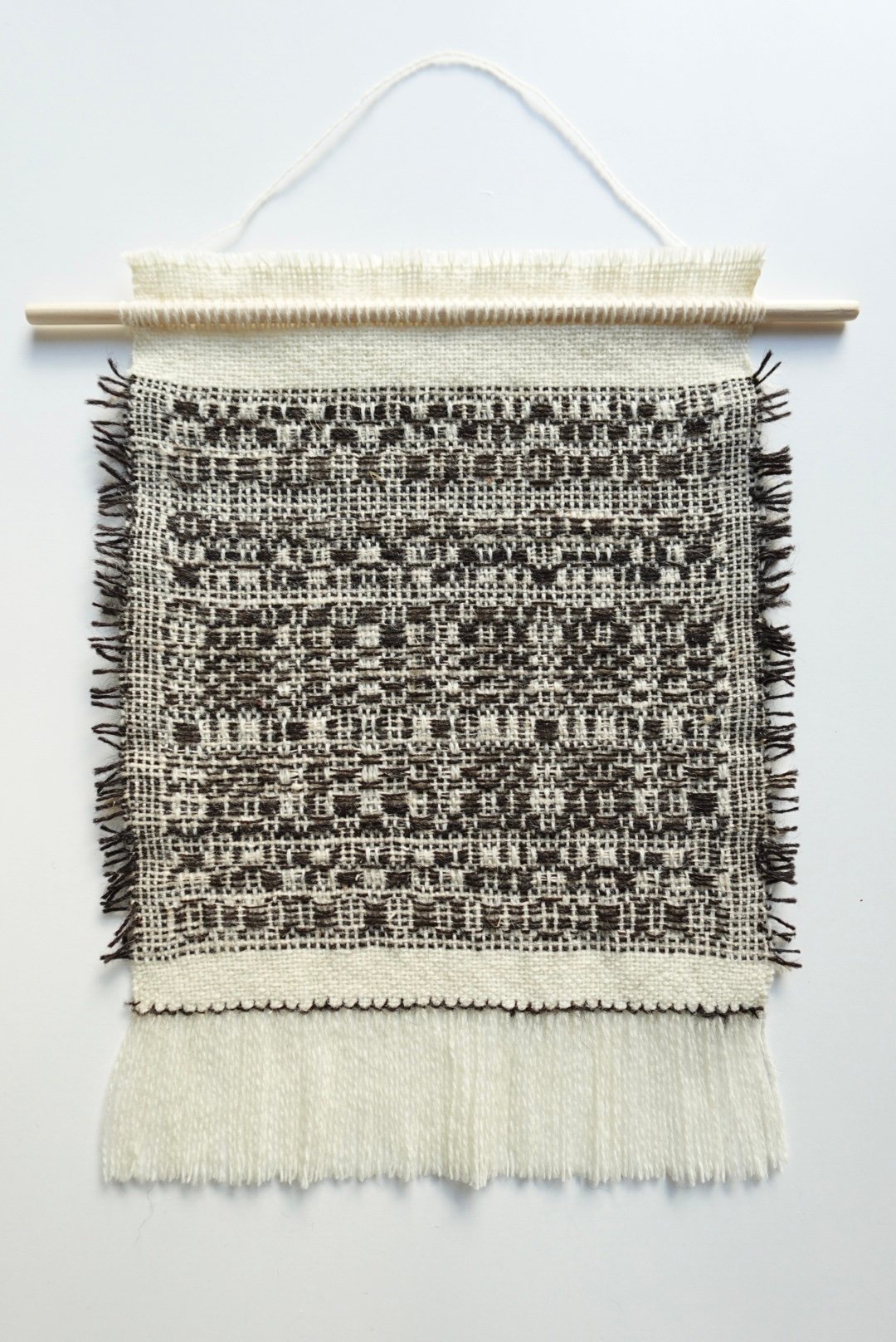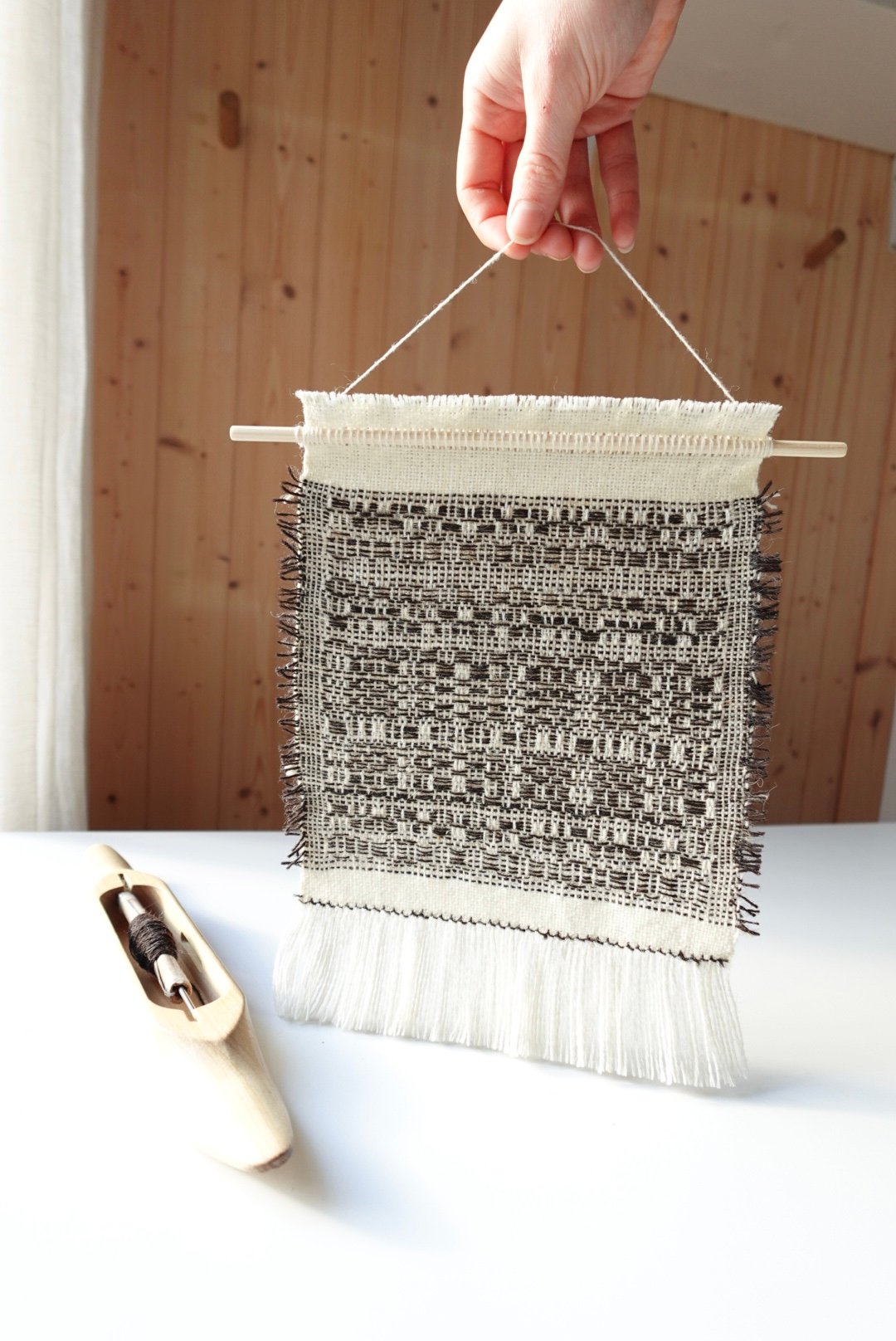 A one-of-a-kind, mini wall hanging. Woven with British wool, with a frayed edge. All of the materials are natural and biodegradable.