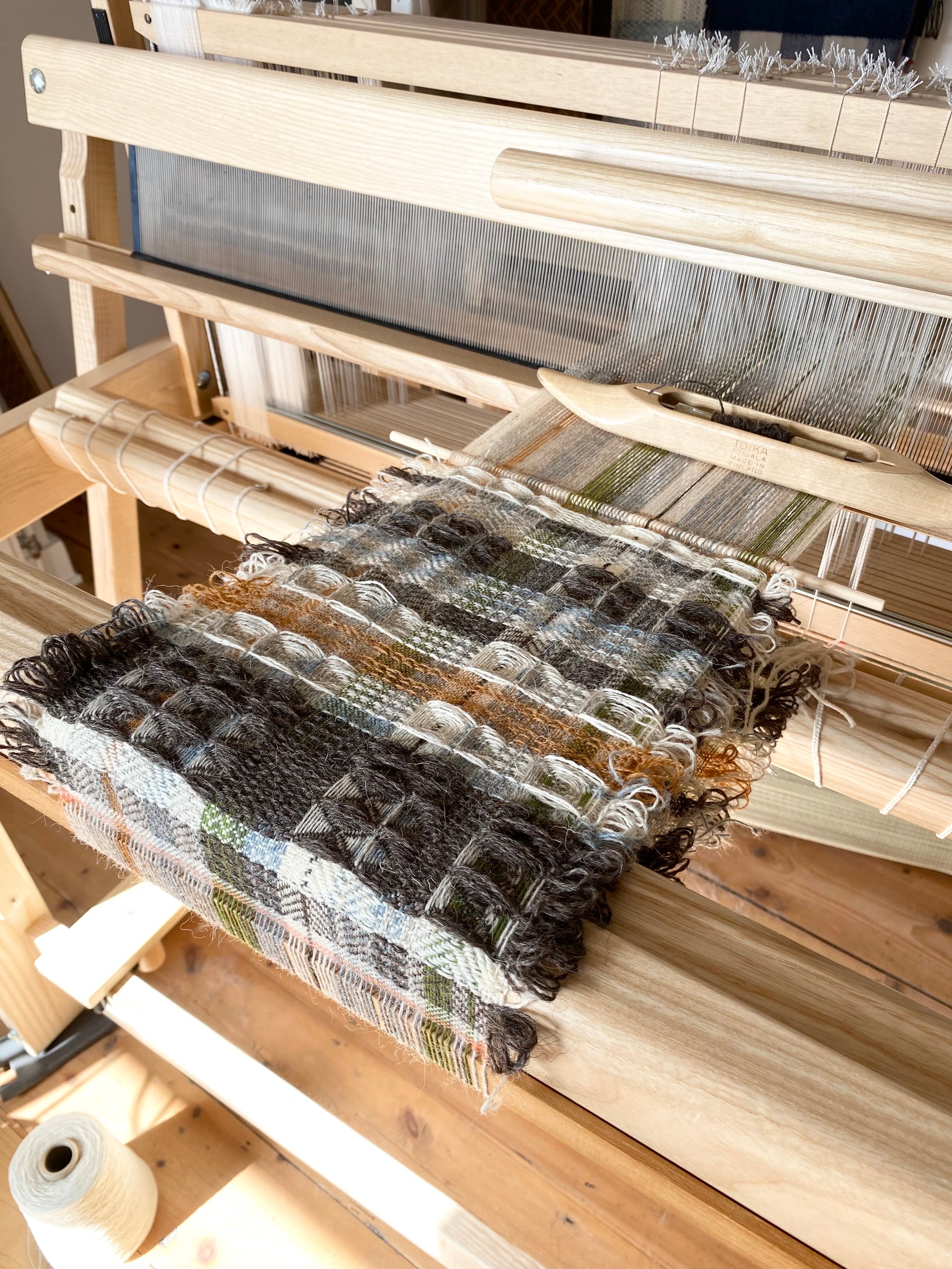 Woven and designed by me, on floor loom, with a three-dimensional waffle block pattern.